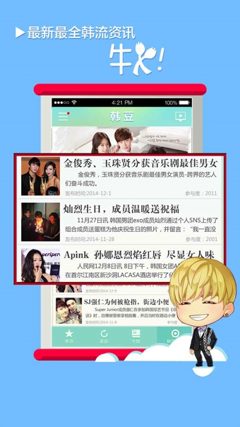 感觉追星很累?苦于不能全方位了解?恨不能零距离接触?希望参与粉丝团一同玩耍?那么赶快下载韩豆吧,韩娱大全!~吴亦凡,鹿晗,exo,少女时代,李钟硕,李敏镐,金秀贤,bigbang,superjunior,东方神起,beast,winner...只要你能说出来,我们就都有。