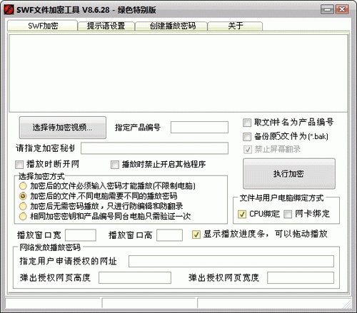 可以加密swf文件,并能够授权播放:可以控制播放电脑、播放次数、播放时间等!用户必须得到您的授权才可以播放,同时还可以防止您的swf文件被反编译或者被一些工具提取;您可以为用户创建播放密码,播放密码与用户的电脑硬件绑定,用户无法传播播放密码和文件。新增了防止屏幕翻录功能;新增播放时断开网络,防止通过网络进行远程翻录功能;新增播放时禁止开启其他窗口功能;加入了播放进度条,可以在播放过程中拖动到任意位置开始播放;可以全屏幕播放。