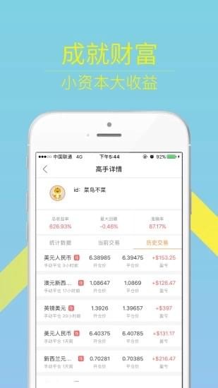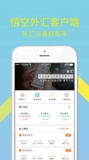 悟空外汇 - 专注于零售外汇保证金交易的投资理财平台。为了让更多用户快捷、低门槛的参与现货学习与投资,我们接入了全球投行即时优质策略,专供用户参考学习的同时,直接应用于实际交易。另外跟随高手“一键跟单”交易模式中,用户无需实时关注行情、资讯,也能通过优选投资高手坐享收益。【软件特点】