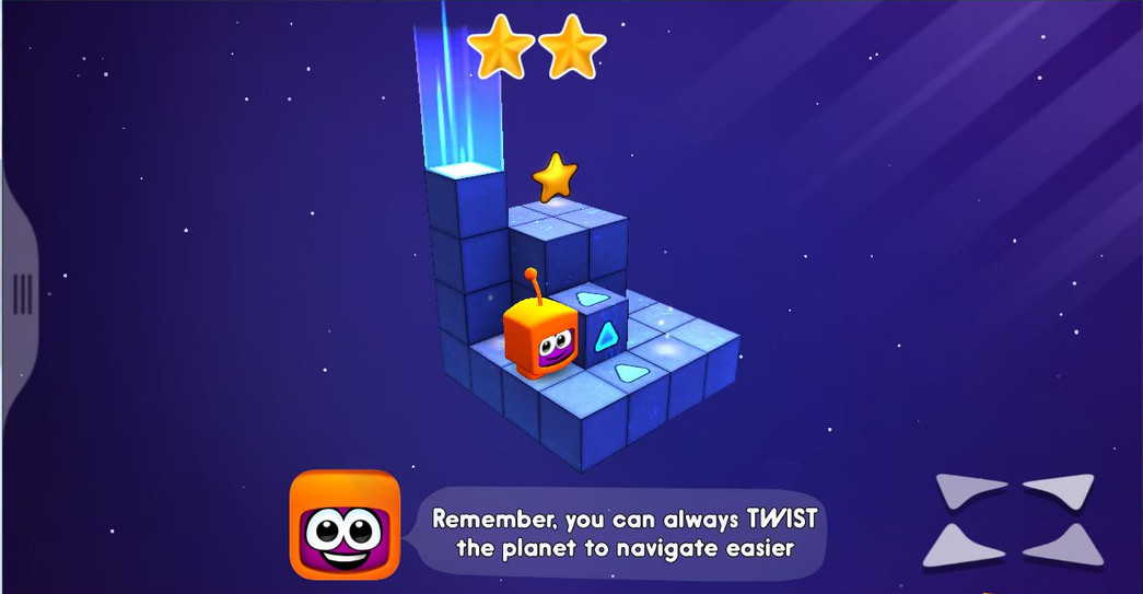 游戏的操作与《纪念碑谷》有所区别,玩家需要点击四个方向按钮来控制角色进行方格移动,当无路可走时可以通过滑动屏幕旋转行星找出新的路径,需要注意的是玩家在滑动屏幕的时候要注意避免主角掉落。当然,旋转后的魔方水平面的变化也如同《纪念碑谷》一般,变化无常,使得画面感以一种多维度度的方式呈现,看起来很有视觉冲击感和想象力。