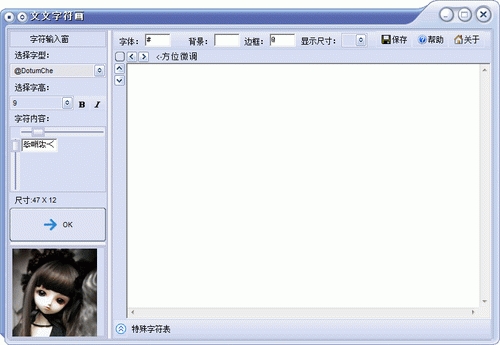 本软件用于制作由很多字符或者文字组成大文字效果的工具,用于QQ,MSN,BBS签名等地方。本软件为绿色软件,无需安装、不带插件、免费注册、界面友好简单、使用方便