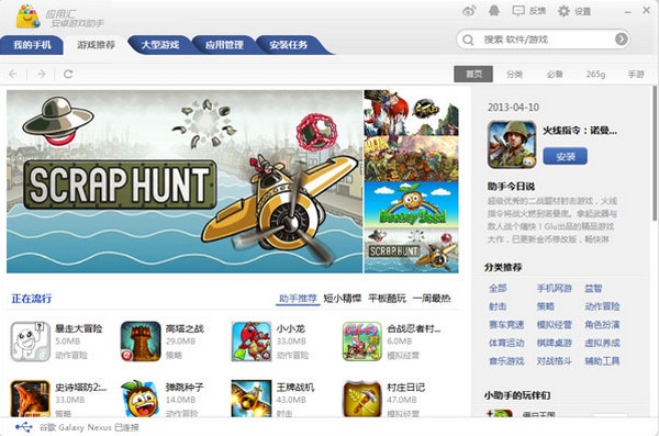 安卓游戏助手轻巧的体积让它能秒速启动,快速通过usb数据线与手机连接,并瞬间安装你所需的游戏文件。