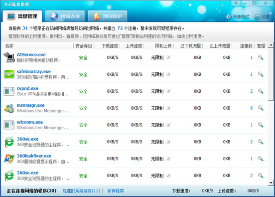 4、打开360流量防火墙后可以查看管理各软件和进程的网络使用情况;