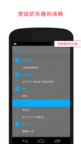 Noded 生来纯粹,简约中又夹有几分小清新。时间轴的整合方式使得界面看上去干净清爽,一目了然。不过具体到某一天内的条目显示上,Noded 并不是以时间的早晚顺序排列,而是采用了「后来者居上」的逻辑,也就是说最后编辑的条目会显示在最顶层。编辑界面同样非常简单,仅接受纯文字输入,滑动时钟标志还可为当前条目加上时间。最后就是为条目安排一个合适的日期,遥遥无期就选「Whenever」,指定日期就选「Later」。Noded 还有一个「Smart Save」功能,双击保存按钮会在保存之后直接返回主屏幕,而单击则是返回时间轴界面。