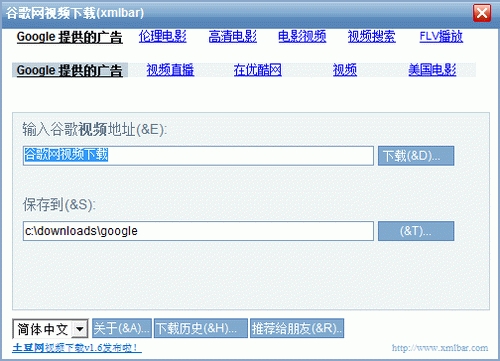 谷歌视频下载(xmlbar)是一个专门下载video.google.com视频到本机硬盘上的小软件。它不但完全免费而且不含有任何插件,可以完全干净卸载。用户只需输入需要下载的video.google.com视频的观看页面地址并按下获取按钮,或者更方便的使用拖放方法将页面地址从浏览器地址栏拖到本软件的浮动窗口,它就会自动识别后进行下载,下载的文件格式为flv。更好的是它还支持多个video.google.com视频文件同时下载,并能显示出真实的video.google.com视频文件的下载地址,下载完后您还可以选择马上播放,而且它还有查看管理下载历史记录的功能