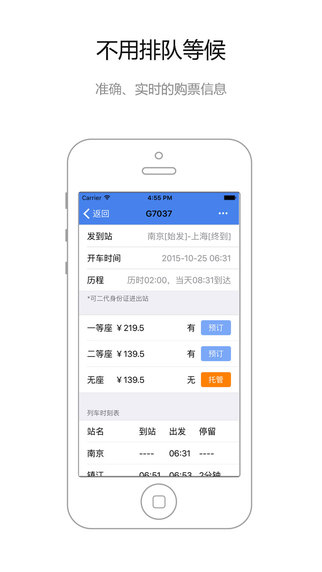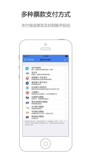 支持支付宝支付票款。票款支付还可选:建设银行、招商银行、农业银行、工商银行(仅限iPad)、交通银行、浦东发展银行、光大银行、兴业银行、华夏银行、北京银行,您还可以尝试更多的银联卡。iPad可以通过银联支持邮储银行等180多家银行,无需开通网上银行,有卡就能付。建设银行、招商银行和农业银行为完全的内支付功能。精简流程、智能记忆,大大降低了操作难度,适于手机和平板操作。车站选择采用拼音首字母索引,也可使用简拼、汉字模糊查询。日期选择提供阴历对照,方便在传统节日购票。支持横竖屏模式,跟随设备360度旋转。iPad下采用左右导航方式,充分利用设备特性。采用发卡银行的手机支付业务功能付款,并通过绑定的手机短信实时确认,确保资金使用安全。在火车站自助售票机、网购窗口或购票窗口免费取票,不用担心假火车票的问题。