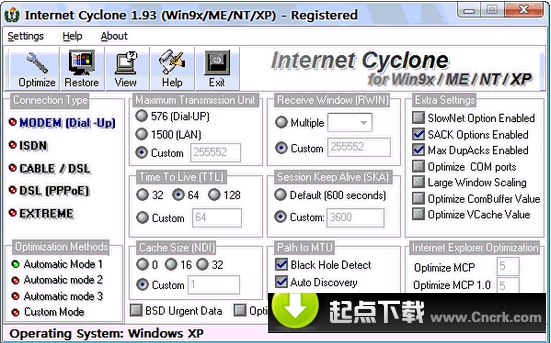 Internet Cyclone [网络飓风]是一款强大而易用的网络(针对TCP/IP协议)优化工具,专为Windows 95/98/ME/NT/2K/XP设计,它可以配置并个性化您的网络隐藏设定,以实现加速网络连接的功能。使用该软件可以加速网页浏览、文件下载、邮件收发、在线游戏以及网上聊天等,并可保证数据传输的完整性。官方给出的数据是最高可加速至200%(Boost your Internet connection speed up to 200%),实际效果当然没这么夸张,玩玩噱头其实没什么,哪款网络加速软件不是玩噱头的,一般提高30%就说明您的优化配置已相当合理了。该软件的优化为一劳永逸的方式,即设置后无需实时运行本软件,因而不会给系统造成资源负担。对于需要常驻系统的实时优化工具我一直很不感冒的,限制A的带宽以提高B的显然是在拆东墙补西墙。而一键加速类的软件更是不屑一顾,吝啬到连个知情权都不肯给用户的软件让人怎能放心去用?Internet Cyclone 也不是无可挑剔,至少未能免俗地来了句“200%”就让我有些不舒服,好在全程操作都有详尽的悬停提示,用户能够明确自己的每项操作系针对什么、有何作用、某种优化又是否适合自己机器的实际情况,在透明度上应该说做的中规中举了。优化前请先使用软件自带的备份功能保存当前的系统配置,然后多测试多比对,以选择最适合自己机器的优化。如果是没什么相关经验的用户,建议选择自己的连接类型后,使用软件提供的自动配置进行优化,不过这样的效果肯定不如手动逐一设置好.