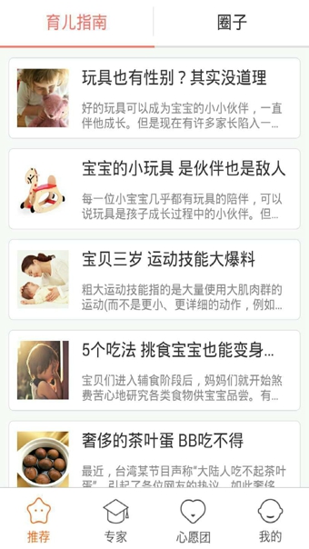 1.新增“育儿指南”,从孕早期到6岁以上,共10个阶段,智能推送孕育专业知识,把握孩子成长每一个细节;