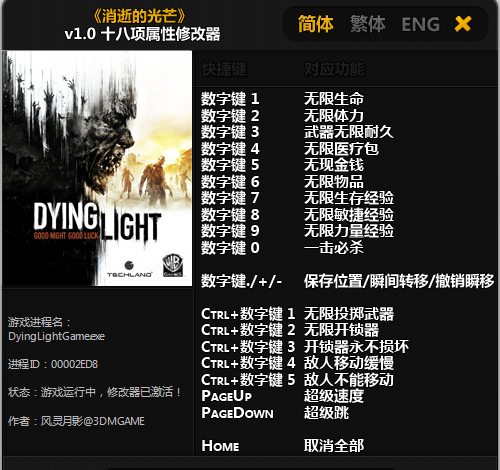 数字键 1 - 无限生命数字键 2 - 无限体力