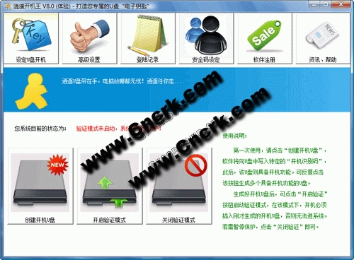 给电脑加上一把U盘锁,开机时必须插入使用本软件制作的开机U盘,否则无法进入系统。想开我的电脑,没那么容易。可使用任意一个或者多个U盘制作为开机U盘,不会损坏U盘内原有文件。生成的开机U盘要妥善保管,谨防丢失、损坏,以免造成无法开机!似乎不支持在VISTA系统下制作U盘