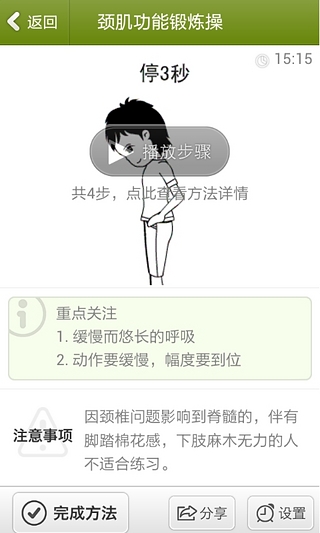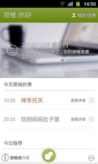 在电脑前久坐的人,经常伏案办公的人,多多少少都会出现一些颈椎方面的问题。别再以为这些病只是老年人的专利了,由于各种原因(缺乏运动、长时间玩电脑等),年轻人出现颈椎方面疾病的频率也在逐年上升。没引起注意的朋友一定要关心下自己的颈椎了,但是不是又苦于没有合适的方法;而那些已经知道的,却往往因为没人及时提醒,而放松警惕。今天给大家推荐一款软件,帮助大家来改善改善你的颈椎——《颈椎,你好》Android版。