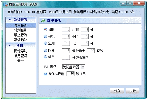 我的定时关机2009 Build 1010 简体中文绿色免费版 《我的定时关机 2009》是一款免费共享关机软件,它不但具有定时关机、自动关机的功能,而且还可以进行定时提醒信息、打开文件、打开网页、重启计算机、注销用户、锁定计算机、计算机休眠、计算机待机、关闭显示器,并且可以进行多任务计划,可以满足不同用户的要求,禁止行为功能可以让你的计算机防止他人的恶意破坏,简洁大方的软件界面,使用户操作更为简单