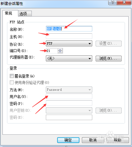 2、在“新建会话属性”中选择“名称”为主机命名,在“主机”栏输入主机IP,“协议”和“端口号”使用默认ftp和21,在“用户名”和“密码“栏输入账户密码。点击确定。