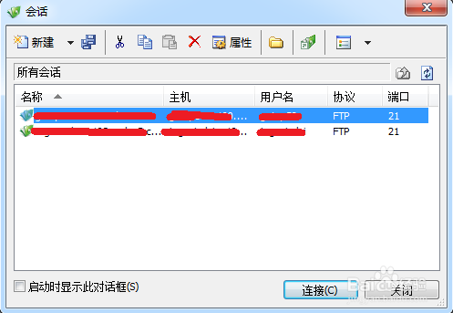 3、回到Xftp主窗口在”新建“按钮右侧有一个文件样式的图标为”打开“按钮,点击该按钮,在弹出的小窗口中选择刚刚新建的主机,双击就连接到FTP服务器上面了。