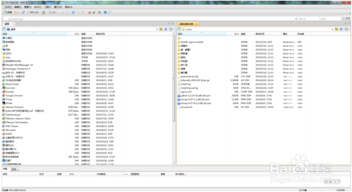 4、连接上FTP服务器之后,窗口右侧会出现FTP服务器目录和文件列表,右键左侧本地将要上传的文件点击”传输“就能将本地文件传输到远程服务器,或者使用左右拖拽的方法也可以上传下载文件。