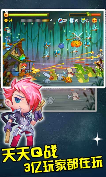 天天Q战是一款画风非常Q萌的射击类游戏,游戏中有一大群的怪物正在接近你所在的小屋,为了保卫自己的家园,不让这些怪物将你的家园破坏,你必须拿起身边任意可以使用的武器,对准怪物,将它们全部消灭,让小伙伴们的生活恢复平静。