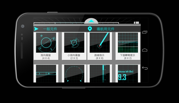 在本应用软体中,提供了许多小元件,供使用者依自己的需求,选取所需的元件,并且在选择完元件之后将该元件放置在合适的面板位置上。例如驾驶员可以挑选导航路线、车速表等元件,自行车运动员可以选择平均速度、加速度及移动距离等元件,登山客则可以选择罗盘方向、高度计等需要的元件来使用。如此一来不同的使用者可以配置出适合自己的导航面板。