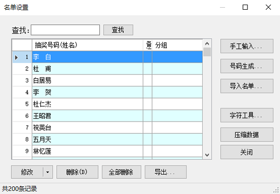 1、抽奖名单:可导入Excel、文本文件;自动生成抽奖编号;导出抽奖名单;