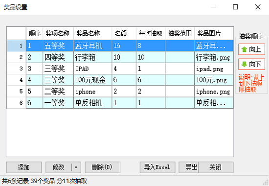 4、中奖结果:不重复、随机中奖,实时保存(不怕断电死机)、打印(可实时打印,)、导出、下次启动后再继续抽奖,支持搜索