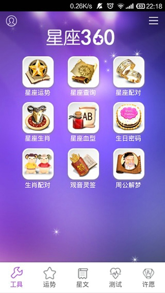 星座360,史上最有趣的口袋星座大师。集成了星座运势、星座查询、星座配对、星座生肖、星座血型、生日密码、生肖配对、观音灵签、周公解梦等查询工具。以及最新的星座文章、心理测试等。