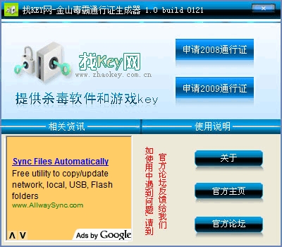 此软件无限制90天的金山毒霸通行证,完美支持金山毒霸2009、2008 VISTA系统下,请以系统管理员身份运行工具。申请的时候 一定要选择新用户 不要选择老用户