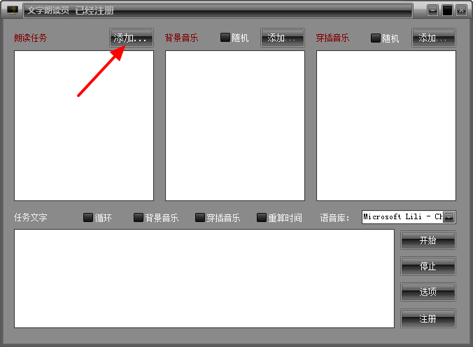 1、首先,请在朗读任务列表上方点击“添加...”按钮添加朗读的任务,朗读任务没有数量限制。