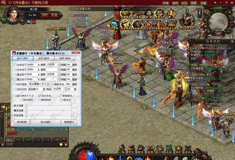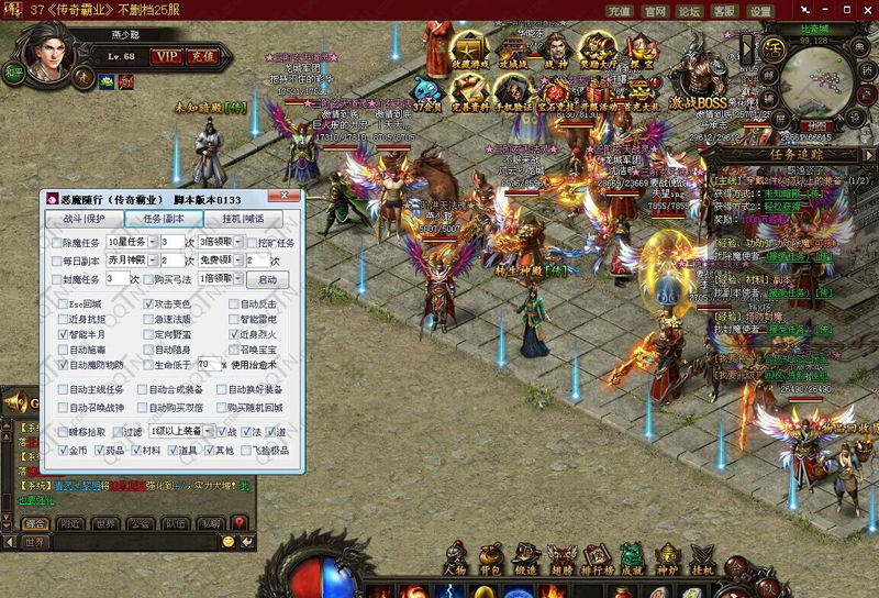 自动除魔任务、自动挖矿任务、自动每日副本、自动封魔任务、Esc回城、攻击变色、自动反击、近身抗拒、急速法盾、智能雷电、智能半月、定向野蛮、近身烈火、自动施毒、自动隐身、自动召唤宝宝、自动魔防物防、自动治愈术、自动主线任务、自动合成装备、自动换好装备、自动召唤战神、自动购买双倍、自动购买随机回城、瞬移拾取、自动过滤、飞捡极品。