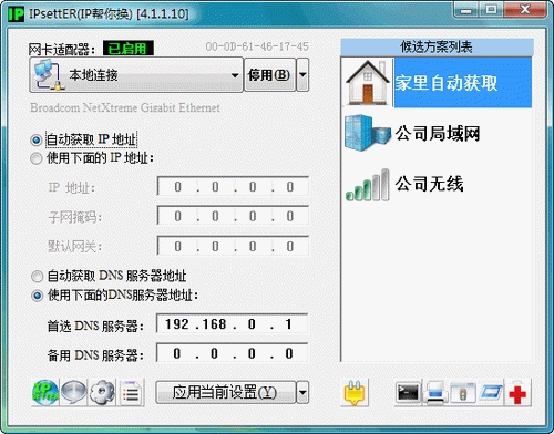 1.精确检测及识别可用网卡;2.快速切换常用IP并提供方便的常用IP管理功能;3.可以方便操作网卡(禁用/启用/修改名称);4.IP冲突检测及自动处理功能;5.界面美观,支持国际化语言界面(中文,English);6.纯绿色软件,可以放在任意目录使用;·主要使用者经常修改IP的人,比如:本本用户,这部分人由于流动性或特殊需要频繁更改IP。软件语言:国际版(中,英)