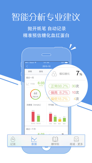详尽的血糖分析报告:根据用户记录的所有血糖数据,糖护士将自动进行分析,并提供详细的控糖建议;最全面的数据管理模式:最好用的数据管理,日志、表格、曲线、饼状图、柱状图,所有数据尽数呈现,一目了然;健康科学的饮食与运动建议:根据用户的的身高、体重等资料,自动计算您每日所需的卡路里和运动量,并推荐每日菜谱、运动项目;实时在线问医生:强大的专业医疗团队,结合您记录的数据,给以更加全面、准确的回答,更可以为你私人定制控糖方案;定时餐后测量提醒:每次想测餐后血糖都会错过时间?设置闹钟又太麻烦?用糖护士只需点一下,餐后2小时专门提醒;