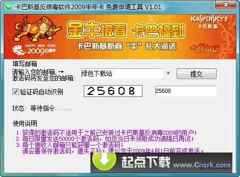 卡巴半年卡申请工具 V1.01 简体中文绿色免费版 1.获得的激活码不适用于之前已安装过卡巴斯基反病毒2009的用户;