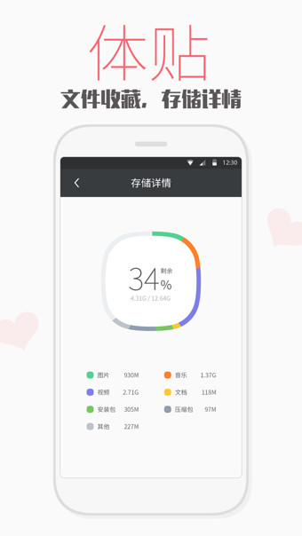 6、自研高速全盘扫描算法,智能分类手机中的图片、音乐、视频、文档、安装包、压缩包;