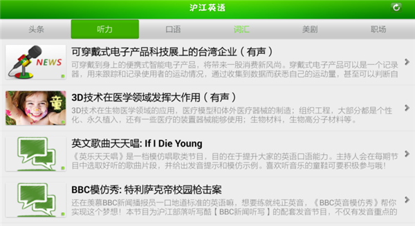 沪江英语TV版是一款英语学习软件。该软件非常小巧并且实用,里面拥有海量的英语练习词汇,帮助用户在线辅导英语,让用户的英语水平蹭蹭蹭的往上升。