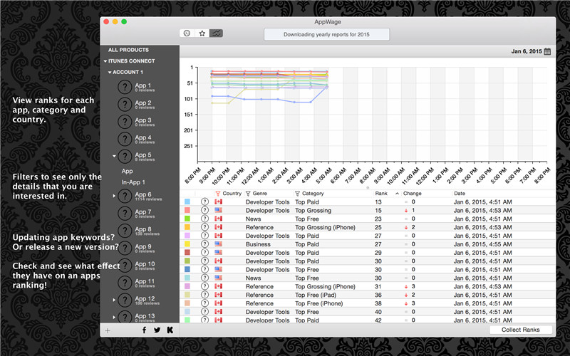AppWage for Mac可以跟踪和分析你的iOS和Mac应用程序销量和排行情况,AppWage允许开发者手动通过收入、下载、更新,以更简单的方式进行拖放或自动下载(包括期权的每日电子邮件摘要)导入他们的销售报告。除了iTunes Connect中的细节,AppWage也收集队伍和评论的任何应用程序(甚至是竞争)。