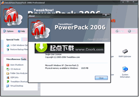 TweakNow PowerPack是1个全功能的调谐电脑操作系统和网页浏览器的工具套装。RAM Idle程序用于管理运行Windows程序所需的自由内存。它阻止由于交换文件频繁进出内存而降低你的系统表现。AutoShutdown程序允许你在特定时间后挂期,休眠或者关闭计算机。除了节约资源以外,本程序保证你的系统更安全因为阻止了未授权的用户使用它。CD AutoRun 是Windows' CD和DVD自动播放功能的扩充,让你有更多的选择来开启程序或者倾听音乐。 Virtual Desktop程序允许你同时运行多达4个不同的用户定制的桌面配制,允许你根据心情和工作需要剪裁你的屏幕。本工具给了你计算机硬件各方面的完整图片,包括你的主板,处理器,显卡,内存,硬盘和网络的详细信息。