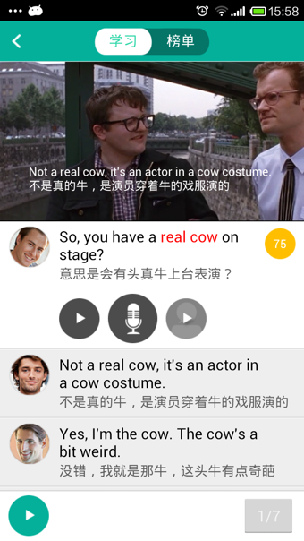 2、跟读影视片段,语音系统自动打分,并纠正发音错误。