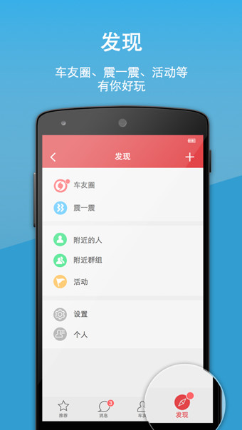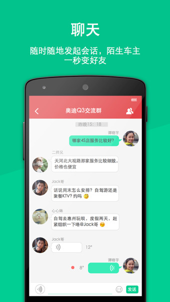 聊天:随时随地发起会话,陌生车主一秒变好友;分享:晒车晒生活,敢秀自己,丰富自己;