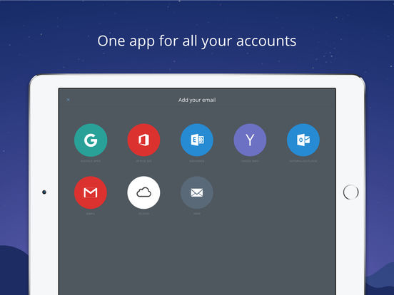 支持任意邮箱类型Gmail、Hotmail、Yahoo Mail、Outlook.com、iCloud、Google Apps、Microsoft Exchange、Office 365、Mail.com、GMX、AOL 以及其它 IMAP 帐户。