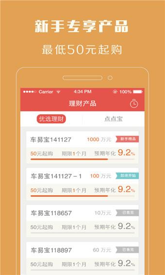 点点宝——预期收益率是银行活期存款的二十倍以上,资金随时赎回、随时到账。优选理财——分为车易宝与房抵贷,风险控制佳,又保证收益不低于行业平均水平。