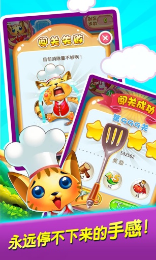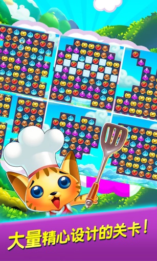 简单操作轻松上手、炫丽的消除爆炸特效、Q萌可爱清新的画面、精心设计的关卡。特色系统:厨房系统和食谱收集系统,不仅让你可以一展大厨风范,更可收集多达几十种大江南北的美食食谱,成为一代厨神!