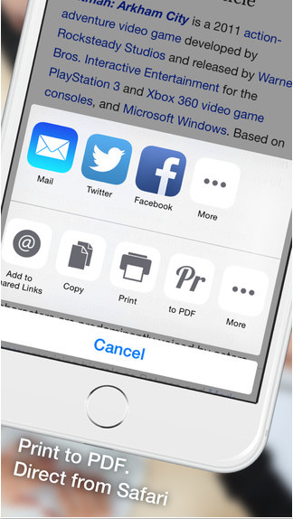 用于Safari扩展的软件,功能非常简单,能够将打开的Safari页面转换为PDF,如果需要还可以直接打印,目前正在限免中,网页转换PDF利用Workflow等软件也可以实现,不过这个软件在使用上更为简便而且功能更加丰富。首先需要在Safari的扩展菜单中打开“toPDF”的开关,然后在打开的网页下面点击分享按钮就可以把网页转换成为PDF格式,转换完毕后可以进行编辑,选择保存或者直接打印。打印时候可以选择纸张大小和打印方式,选择保存的话可以保存到软件本身,以后可以打开查看,也不失为一种离线网页内容的好方法。