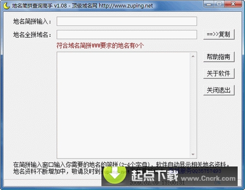 地名简拼查询高手 V1.08 简体中文绿色免费版 玩拼音域名经常需要查询2、3个字母代表的哪个城市,为了解决这个地名查询的烦恼,我们公司开发出这个快速查询城市地名的软件,只要在里面输入城市地区的简拼,比如SY,软件自动查找出符合出简拼的城市和地区,简短实用,软件方便初学者上手操作,配备在线帮助和客服QQ,有任何问题,欢迎咨询。敬请关注我们网站(zuping.net),随时更新软件,提高米农的战斗力,挖掘出拼音域名的精华