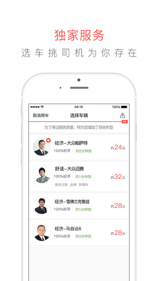 【随时随地或者未雨绸缪】叫一辆车立即来接,或者预约一辆明天的车。你的行程再也不用没谱的飘来飘去。上万辆车,随时候命,为你提供接送服务。