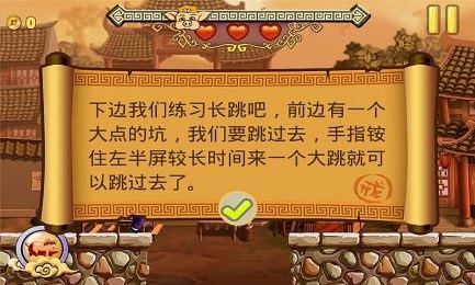 我们要跳跃大坑的时候,手指按住左边屏幕较长时间来一个大跳就可以跳过去了哦!