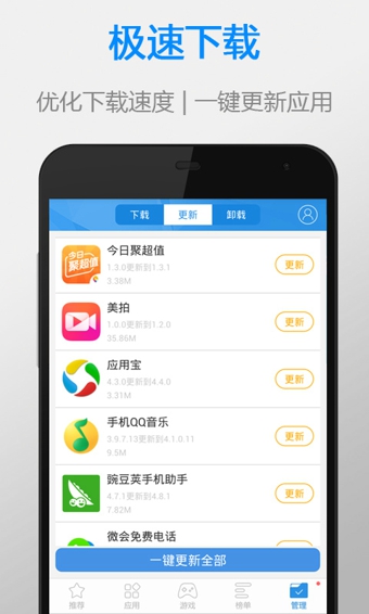 3、优化下载速度,完善应用更新、卸载、推送功能;