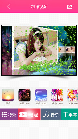 天天视频,是一个功能强大的"视频制作"软件,具有多种视频模板选择,只需简单几步就能制作精美的视频,能实时看到视频效果,生成导出视频只需十几秒的时间,支持分享到各大微博,导出到相册,WiFi导出(电脑查看更清晰),是最好用的视频制作分享app。【软件特点】
