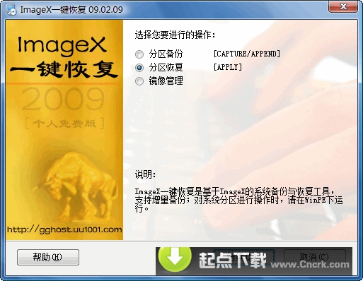 ImageX一键恢复是基于ImageX的免安装系统备份与恢复工具,支持增量备份;对系统分区进行操作时,请在WinPE下运行。 完全操作三步曲: 1,选择恢复或备份 2,选择操作盘符 3,选择镜像文件