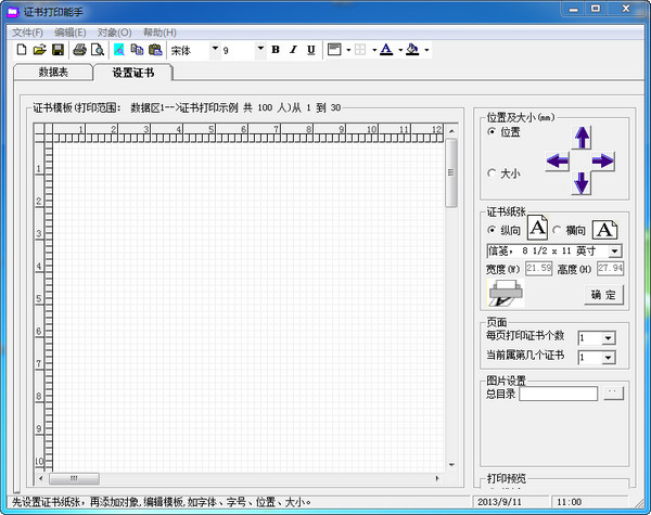 可按证书纸张大小设置模板页面,能设置为纸张方向,纵向、横向,大小。