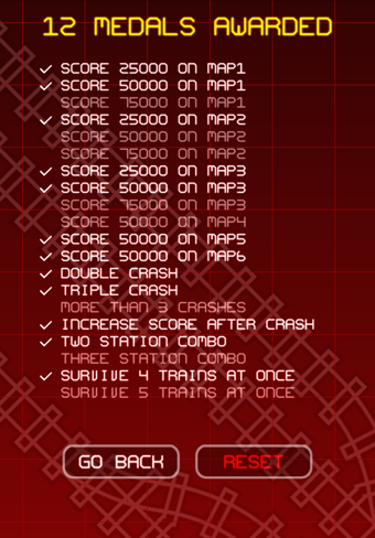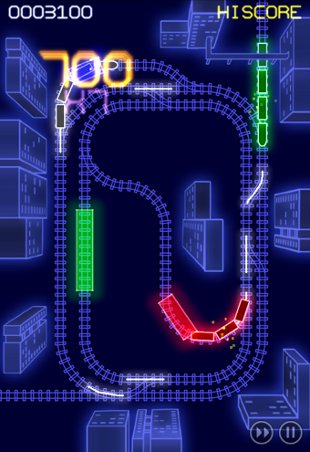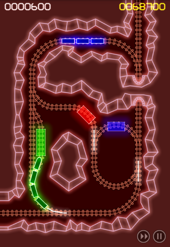 《电动火车 ElectroTrains》是一款荧光灯风格的铁路管理游戏,相信大家对这个游戏模式不会陌生。游戏中并没有关卡模式,在6张地图中全部是无限模式,最往后面的地图,难度也就越大。在游戏里,玩家们要做的就是控制每个分叉口的开关,它可以改变轨迹路线。另一个就是红绿灯的控制,它可以让火车停下,防止火车相撞,每辆火车驶出地图之后就会得分。由于模式少,玩起来可能会有点枯燥,不过其美丽的荧光效果和难度上的挑战会掩盖这个不足。