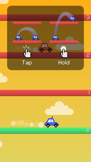 汽车弹跳iOS版操作方式通过点击触屏来进行汽车的跳跃,单点屏幕汽车就会进行小跳,跳跃高度不足以跳至下一个平台上,却能够避免迎面而来的汽车,而长按触屏小车则会进行长距离跳跃,高度则足以到达下一个平台。操作难度很低,非常容易上手。