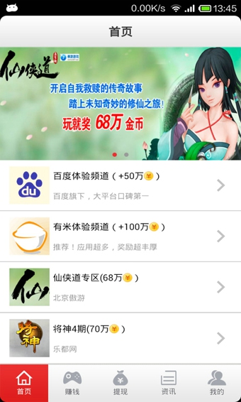 1、手机赚钱:进入手机赚钱频道,选择体验平台。按要求下载和安装,即可轻松领取金币奖励。2、试玩动态:随时了解有赚网PC端游戏试玩上下线动态及奖励发放。方便快捷,一切尽在掌握中。